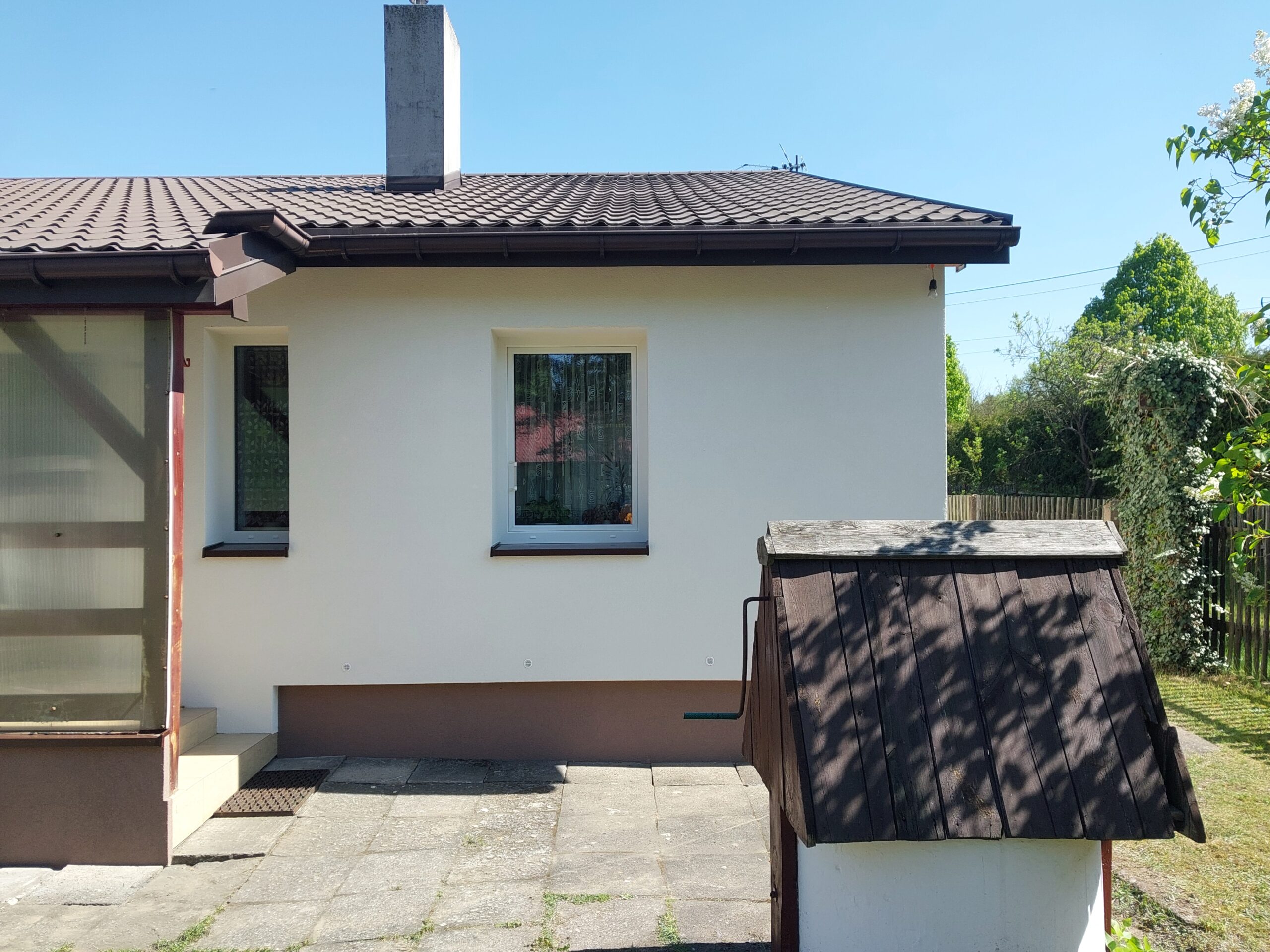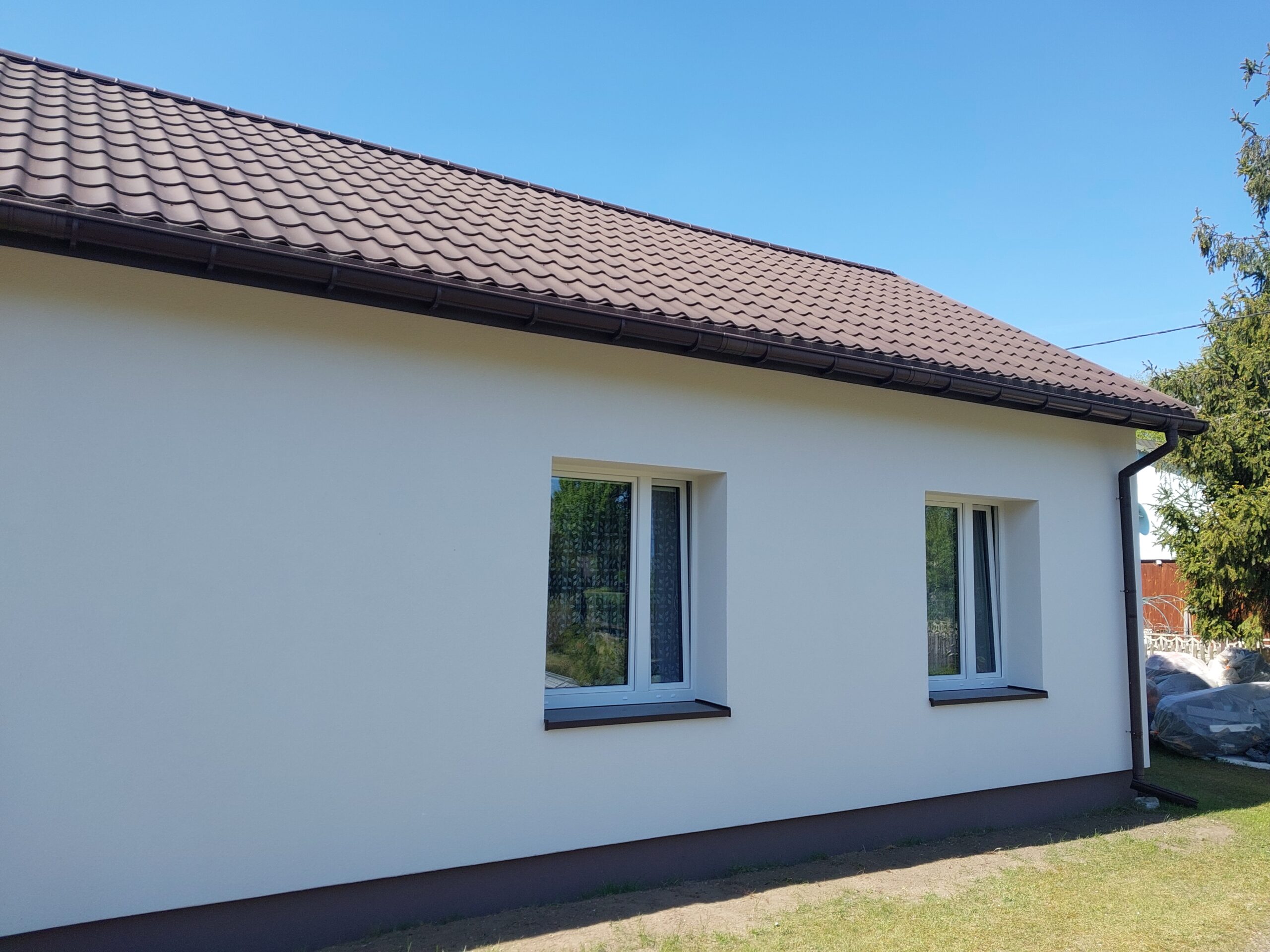 Kompleksowa modernizacja domu Pani Michaliny objęła wymianę stolarki okiennej oraz ocieplenie fasady i stropu, co znacząco poprawiło komfort cieplny i obniżyło koszty ogrzewania.